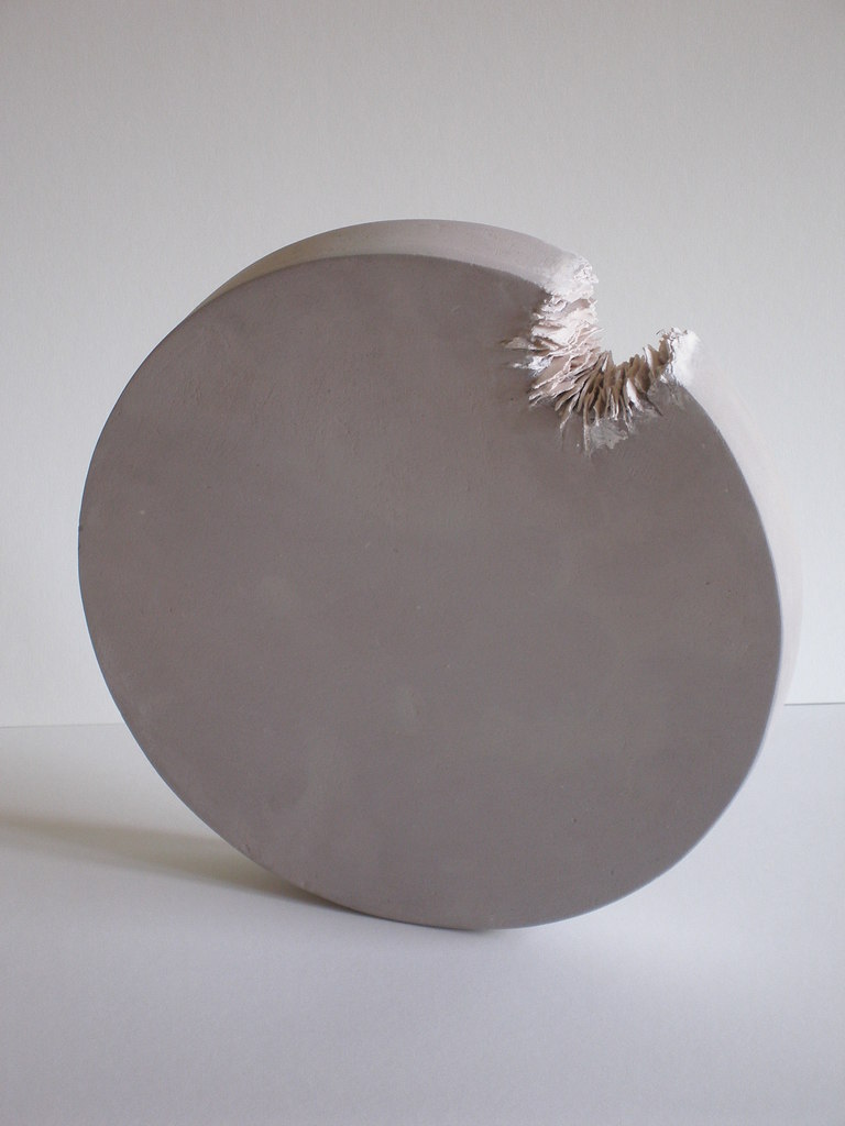 Cirkel: doorsnee 25 cm. De hap uit de cirkel is voorzien van dunne porseleinen plaatjes Op een verweerde standaard van oud ijzer.