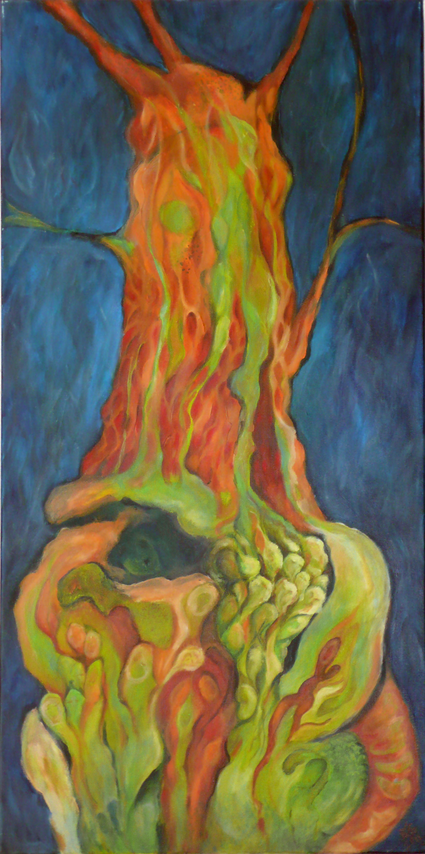 Een drietal schilderijen waarin bomen de basis vormen als uitdrukking van gevoel en leven. Hier: de boom van onderaf bezien. Wat je wilt bereiken ligt ver boven je, nog een lange weg te gaan. Verbeelding van het gevoel dat je veel moet doen om iets te bereiken in je leven .