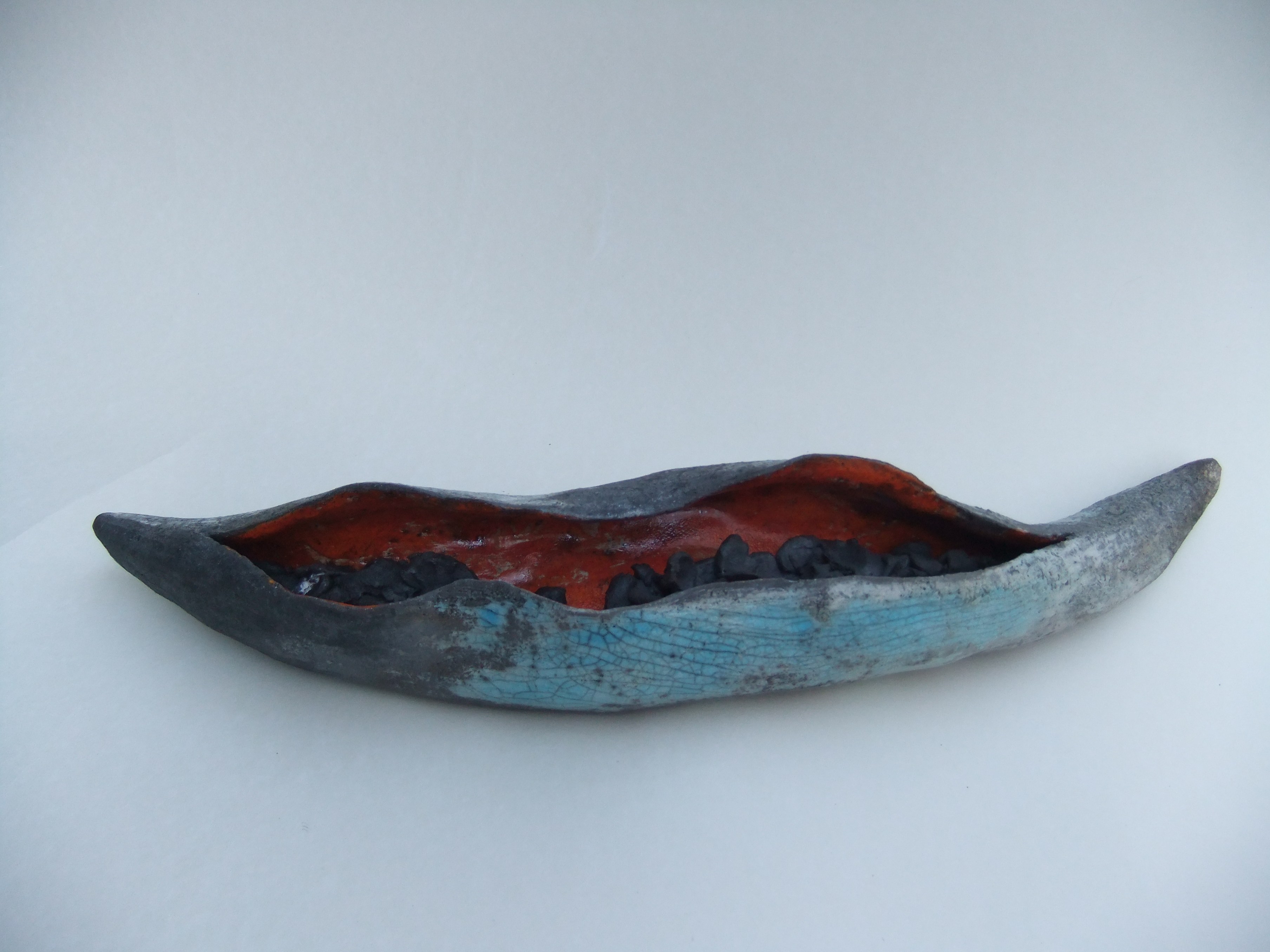 Een peul die openspringt en haar inhoud toont. Raku gestookt