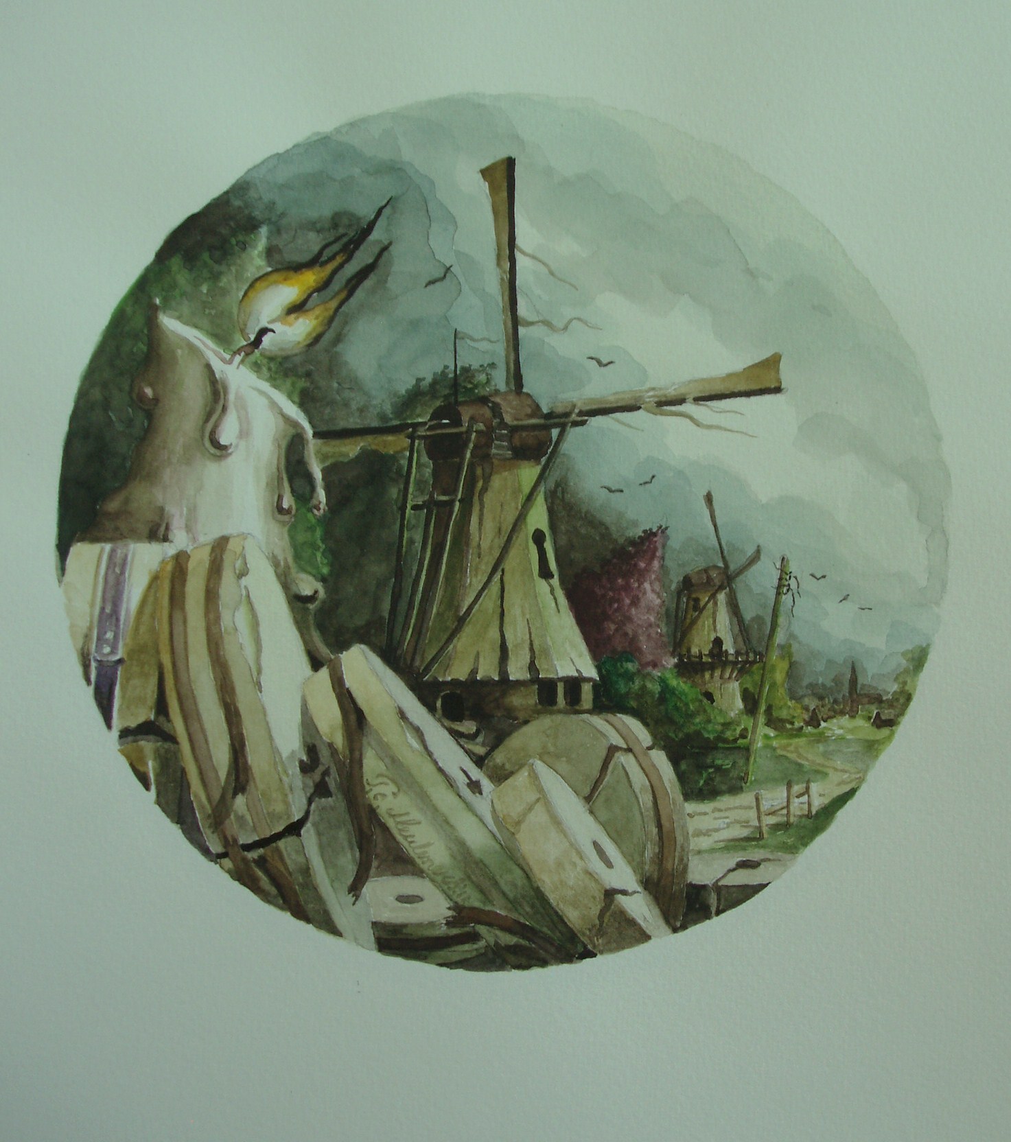 Molensteen Kaars Molen Aquarel Papier Rond Landschap Realisme Fantasie Romantiek Lucht
