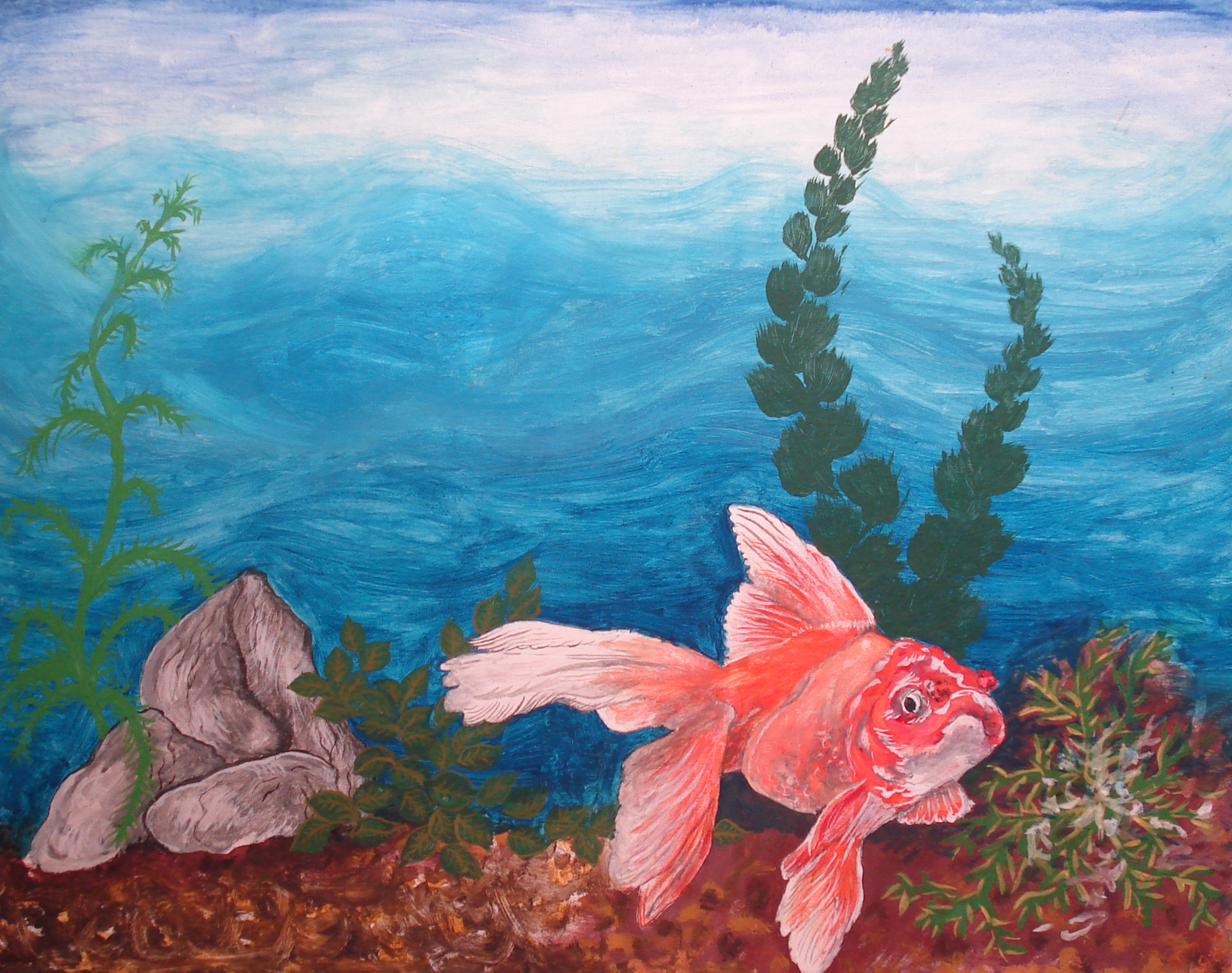 Ik begon met het schilderen van deze goudvis, vol bewondering over zijn kleur en zijn prachtige staart en vinnen............................