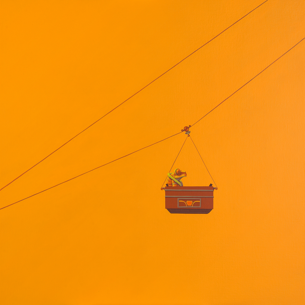 Oranje schilderij van een kikker die een rit maakt in een kabelbaan