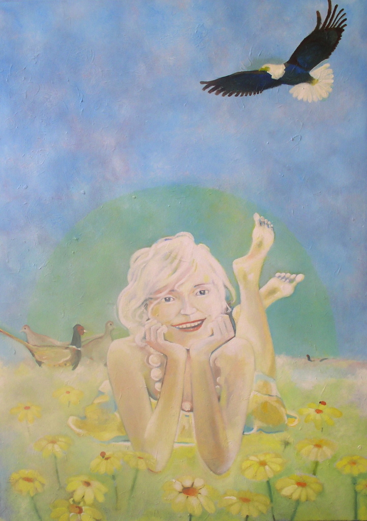 Vrouw Open Liggend Jurk Gras Madeliefjes Lieveheersbeestje Fazant Man Adelaar Lucht Geel Groen Blauw
