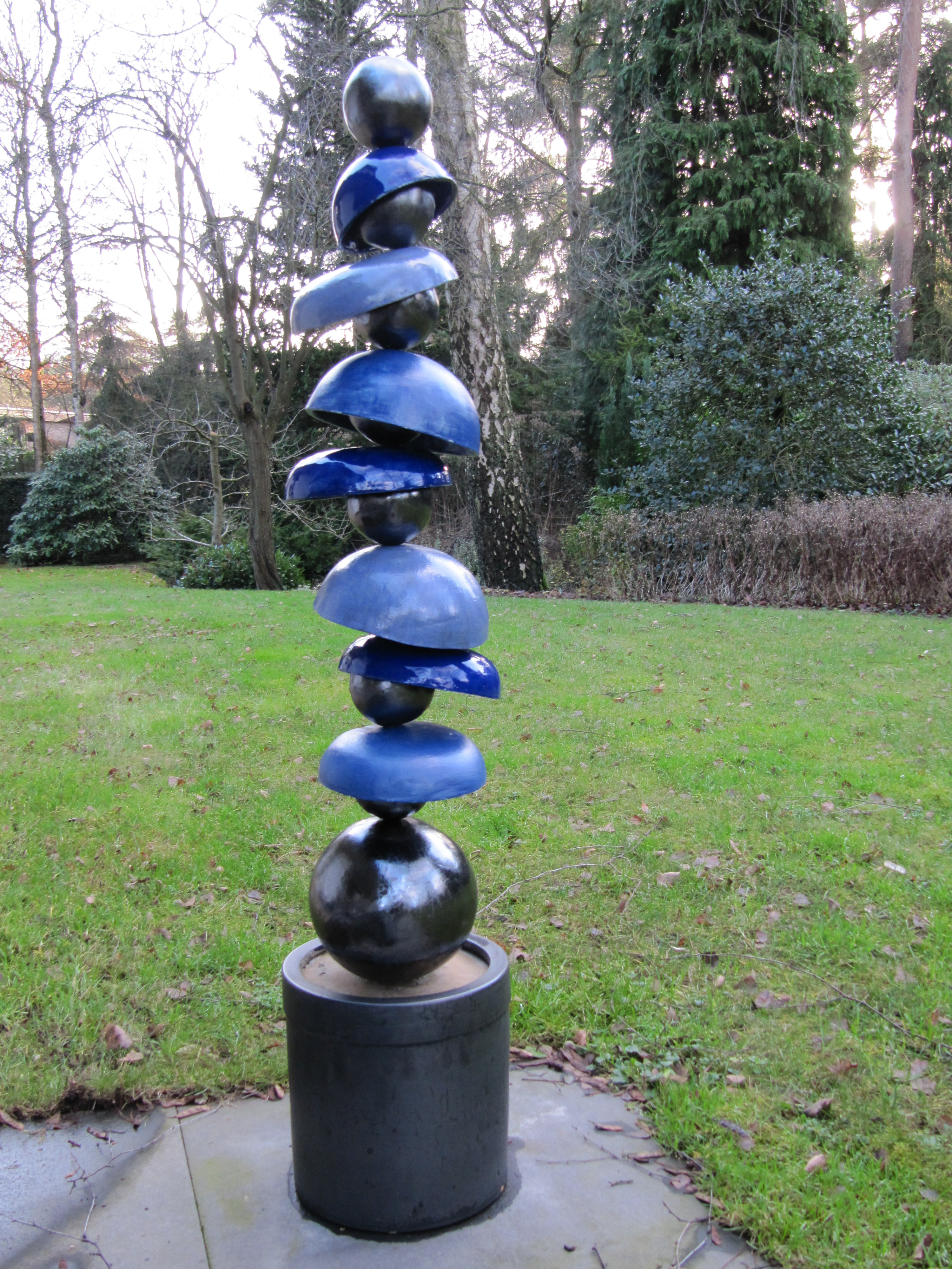 7 schalen in 3 kleuren (blauw) glazuur, gestapeld op zwart (spiegel) bollen. De schalen en bollen staan op een ijzeren pen die verankert is in een zwarte pot. Het geheel staat in beton. Het object weegt meer dan 40 kg.