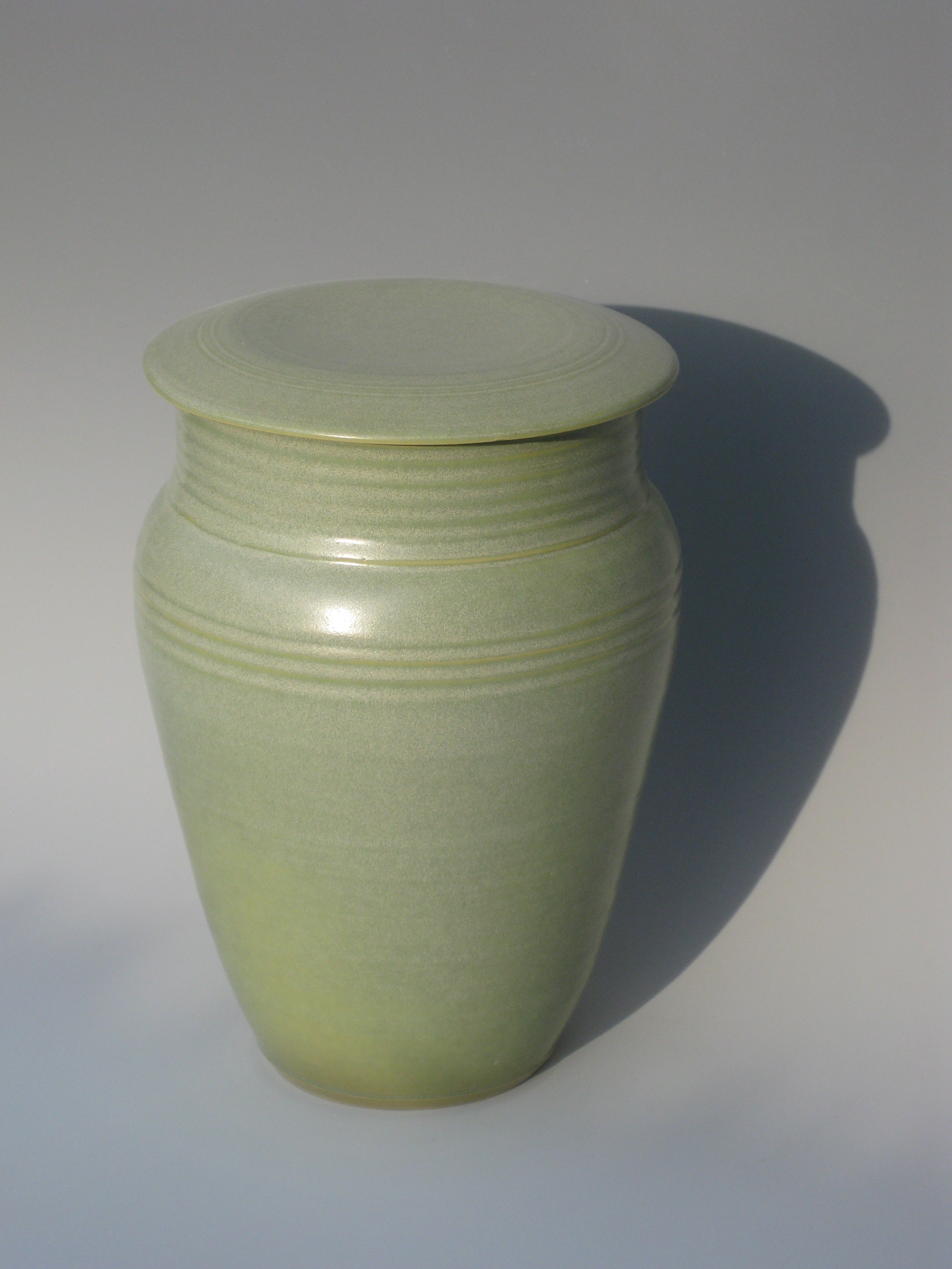 Grijsgroene urn met satijnachtige glans. Ambachtelijk op de schijf gedraaid en voorzien van een eigen glazuur. De urn is op 1250 graden gestookt dus ook geschikt voor buiten. De inhoud is 5 liter.