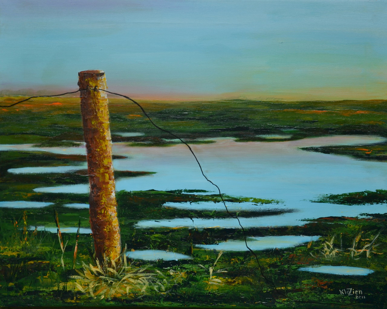 Landschap Winter Zonsondergang Paal Water Blauw Groen Oranje Weiland