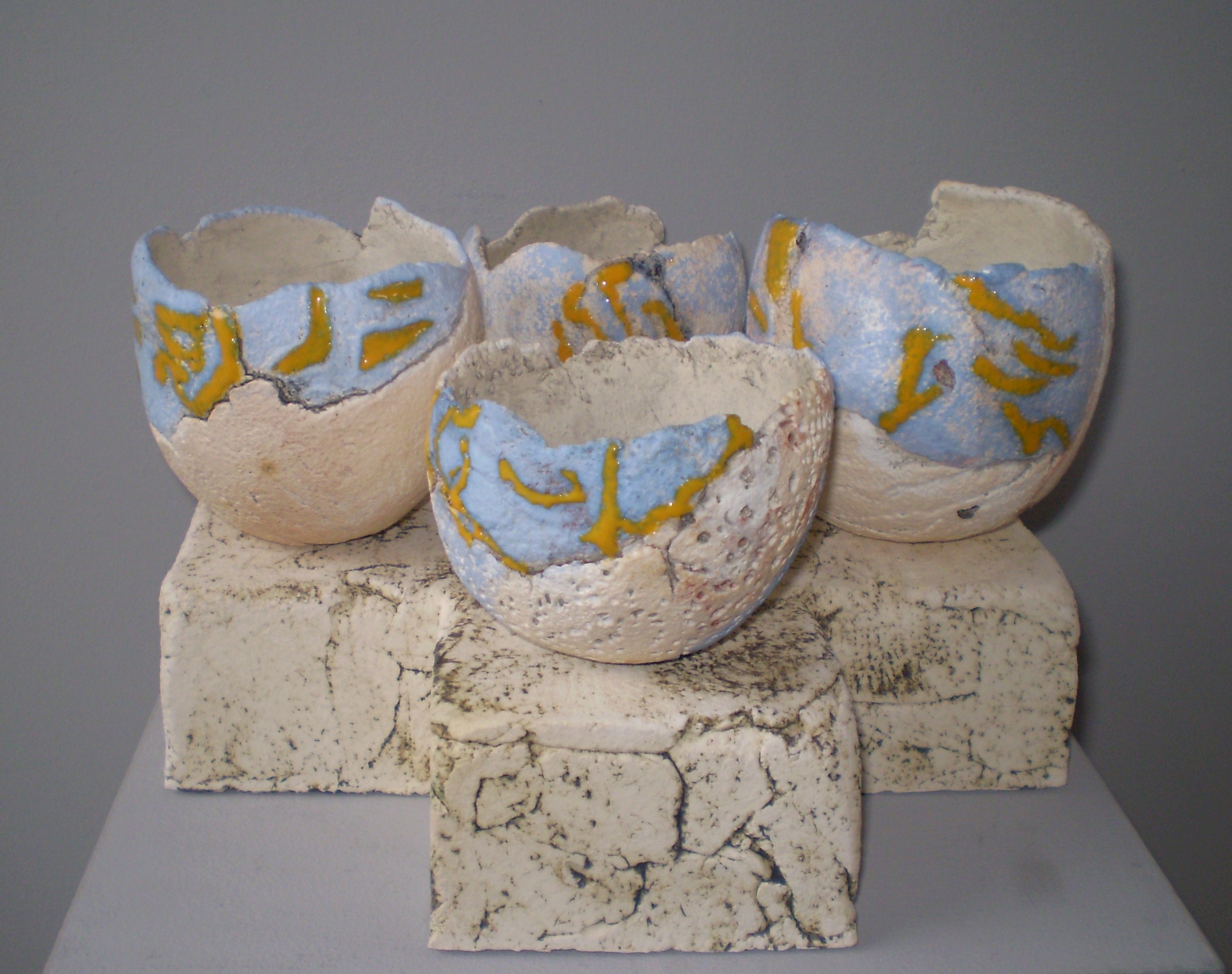 4 kommen op kruisvormige sokkel...handvormen...bewerkt met engobes en glazuur en oxyden.