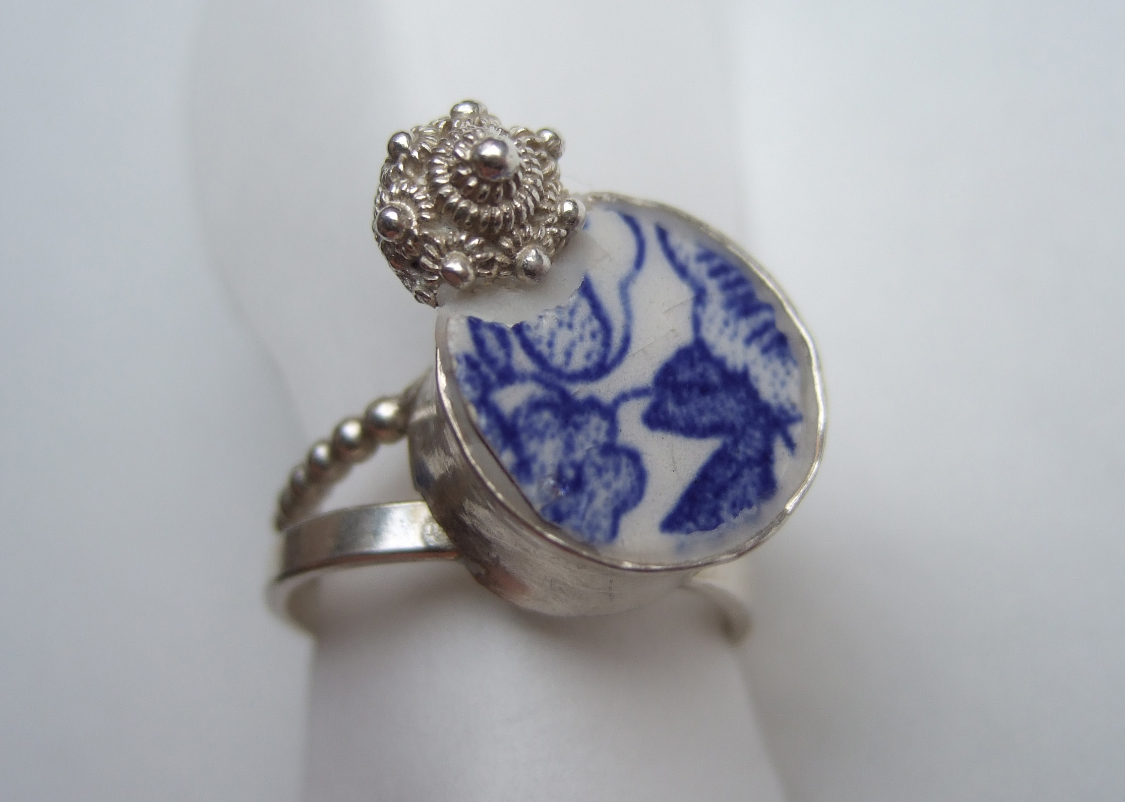 Waar Zeeland ( oud-zeeuws knoopje) en Holland (delftsblauw) elkaar treffen in zilver. Uniek exemplaar. Verkocht kijk ook Hollands glorie: variatie