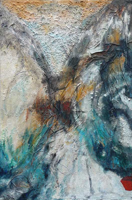 Iets in de buitenwereld intrigeert mij en door deze impressie uit te werken wordt zij blijvend deel van mijn binnenwereld. Laag na laag bouw ik aan de uiteindelijke vorm. Tijdens het werken komt er een stroom van associaties op gang. Het is een constant zoeken naar evenwicht tussen de verf en de andere materialen.