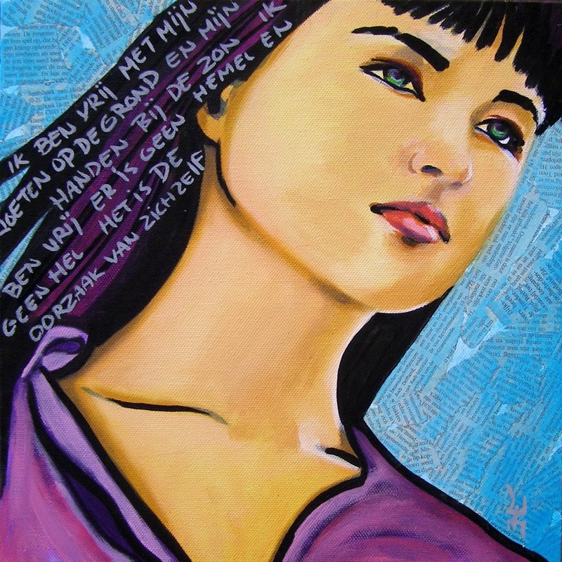 Eén van vier kleine (40x40cm) doekjes. Acryl in combinatie met krantenknipsels.