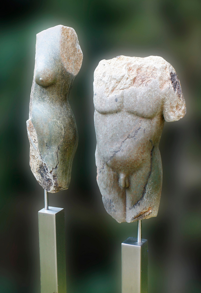 Duo is gemaakt van serpentijn. De halve vrouwentorso en driekwart mannentorso zijn samen geplaatst op een roestvrijstalen sokkel.