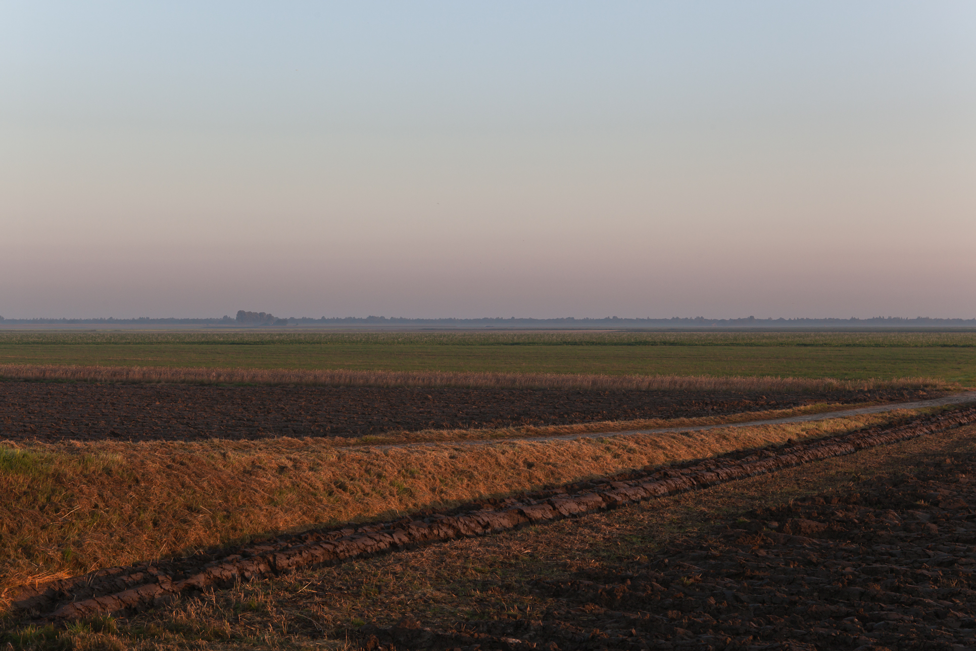 Vlak minimalistisch polderlandschap in najaarstinten en lijnen
