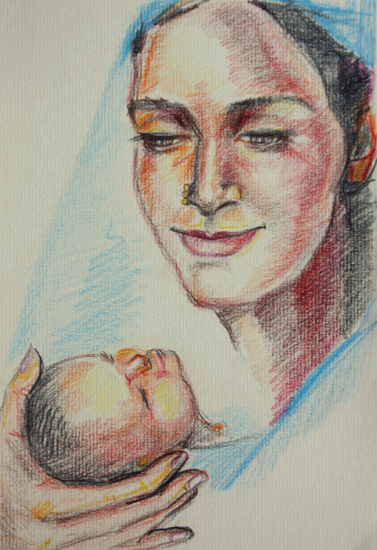 Vrouw Kind En Shawl Moeder India Kleurpotloodtekening Lichtblauwe