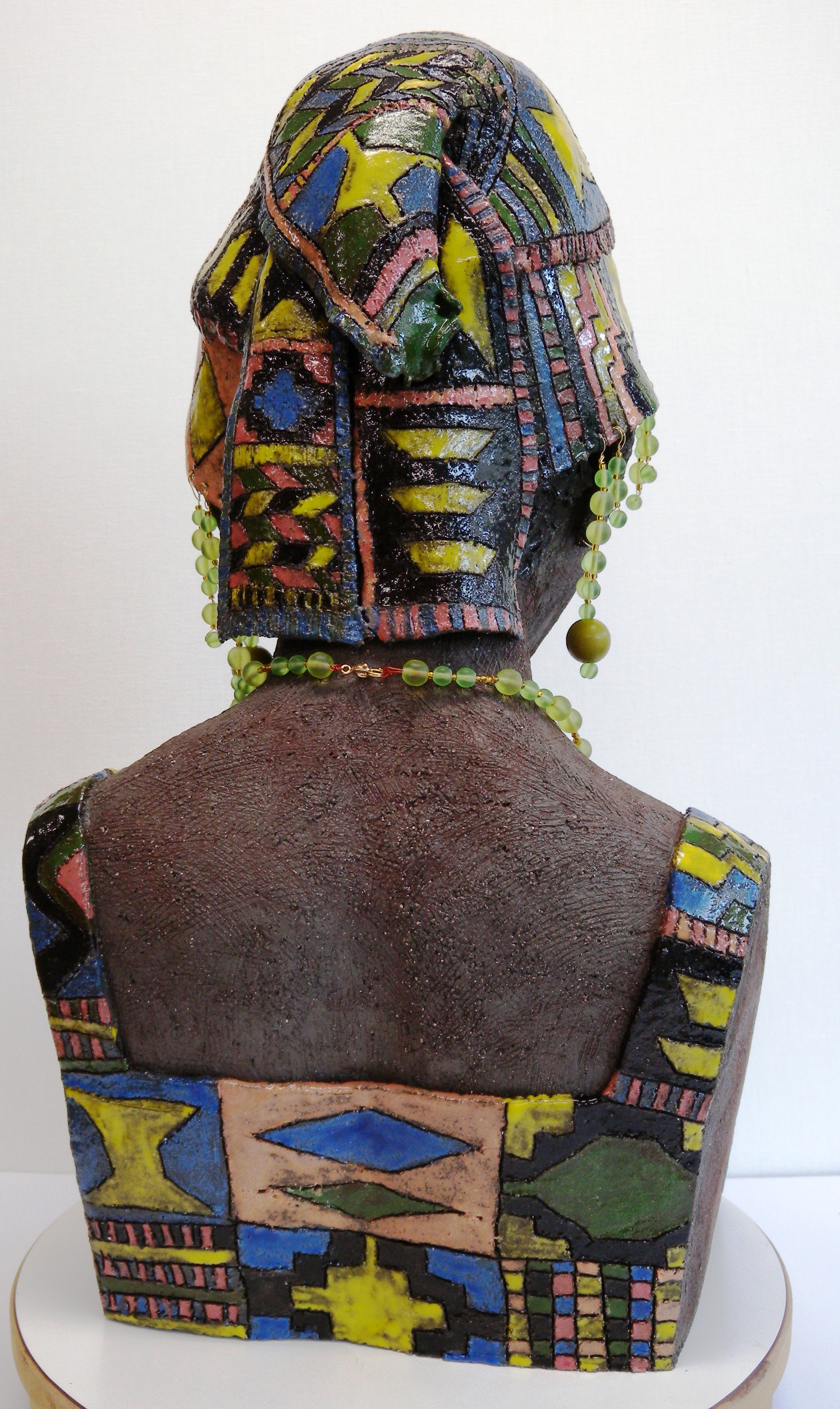 borstbeeld van Afrikaanse vrouw met kleding geïnspireerd op Ashanti in Ghana keramisch, steengoedklei met glazuur