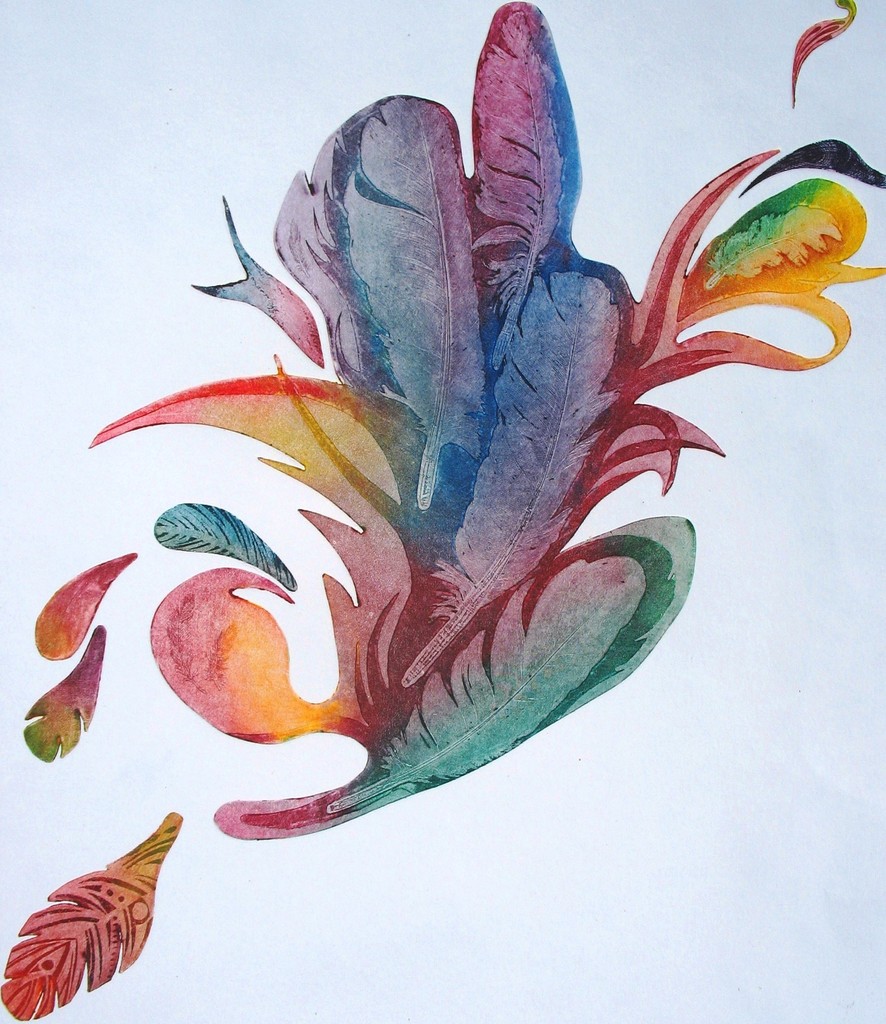 Een voor mijn werk representatieve ets. Deze derde staat (derde versie) van Herfsttooi is het eindproduct van een ontwikkeling naar een losser geheel. De eerste staat van Herfsttooi was een gesloten rechthoekige ets van veren, die in met de vernis-mou-techniek waren ge-etst. De veren worden dan in de zachte etsgrond gedrukt. Om de ets minder "vast" te maken, begon ik de hoeken eraf te zagen en enkele veren erbij te etsen. De ets werd al veel losser. (tweede staat). Tenslotte heb ik de hele rechthoekige vorm weggezaagd en begonnen de veren ook echt te zweven. Afdrukken is bij deze ets echt een uitdaging, omdat je met kleuren alle kanten uit kan. Oplage: 25