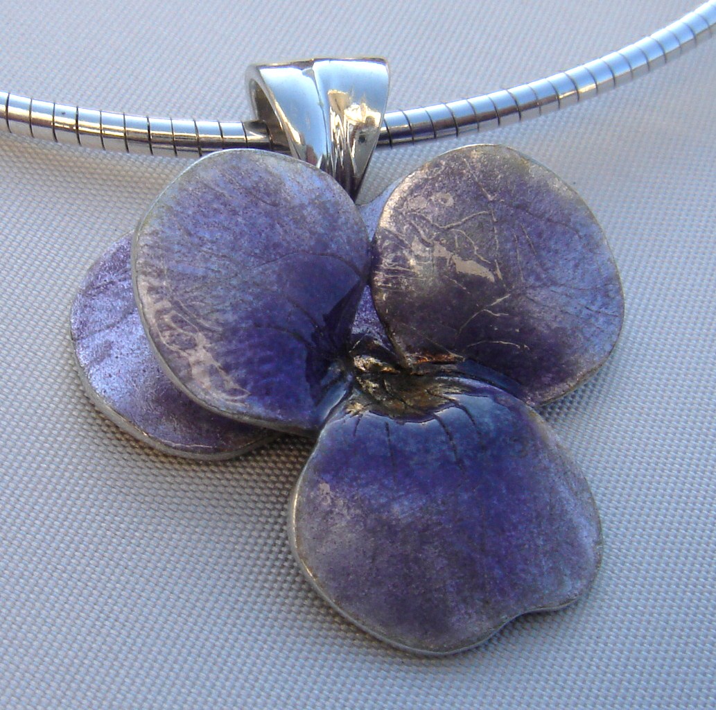 Viooltje 3D, op fijnzilver aan zilveren collier.