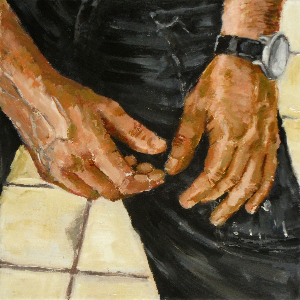 Handen van Hans v Duyn, een kunstenaar, We hebben het plan om samen te gaan exposeren. Combinatie van materieschilderijen en handen.
