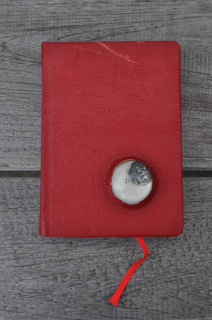 Handgebonden noteboek. Gebonden in leer met de lens van een oude knijpkat waaronder een dubbeltje uit 1942.