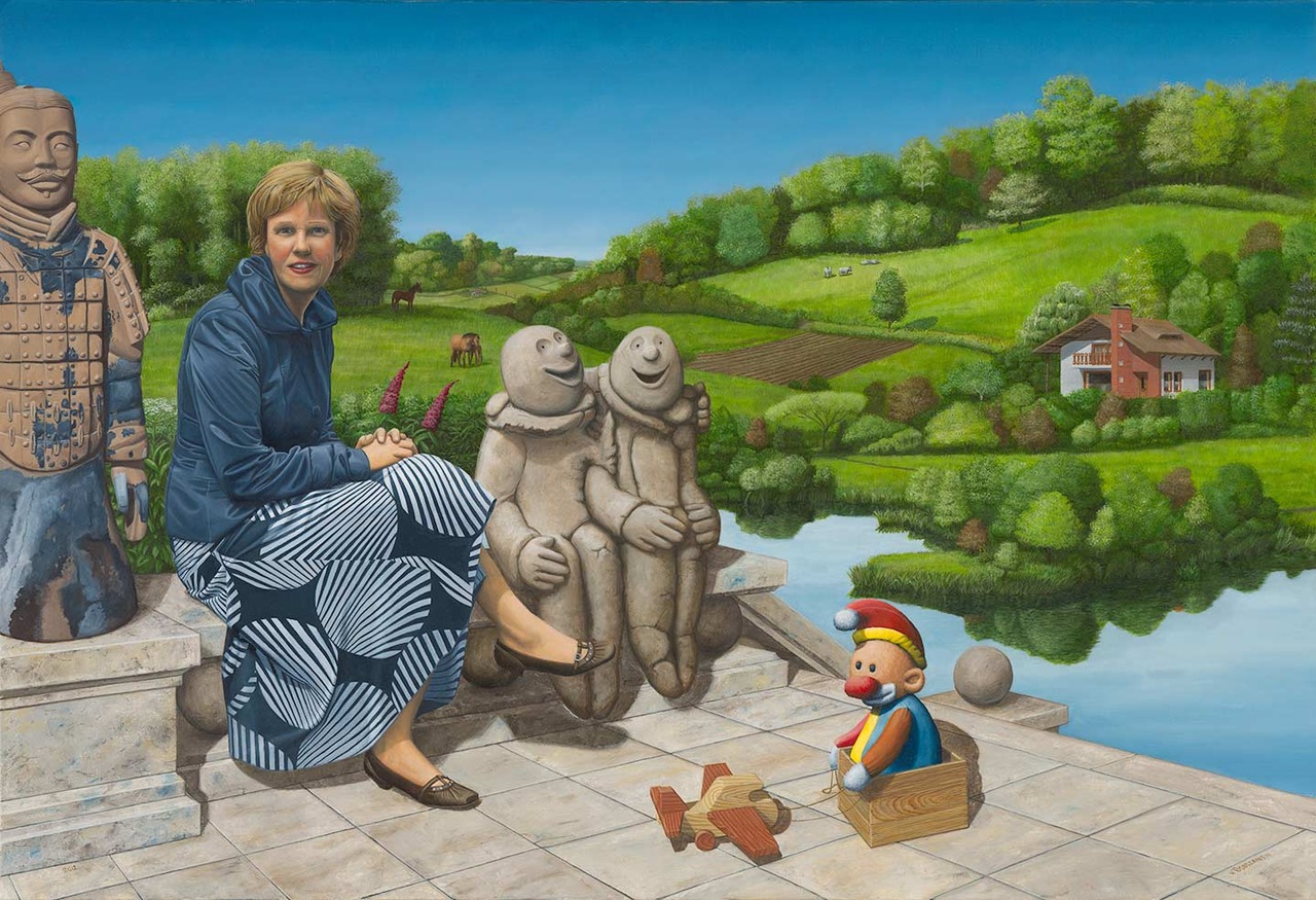 Opdracht voor een portret met een vrije interpretatie. In het schilderij zijn themas verwerkt die betrekking hebben op de opdrachtgever.