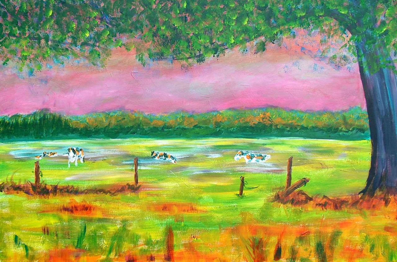 Een Drents doorkijkje. Door de 'vensters', die ontstaan door de bomen en struiken op de 'strubben. (de scheidingswallen tussen landerijen) Ik heb geprobeerd me niet te houden aan de bestaande kleuren, maar deze te 'vertalen'.