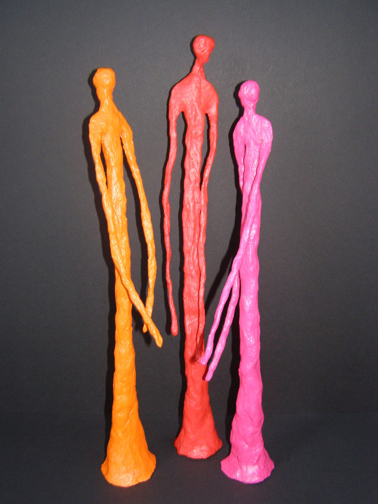 Trio figuren in ongebruikelijke (ver)houdingen. Verkocht.