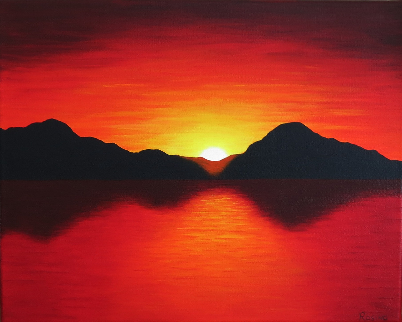 Marieke Rosing Loppersum Zee Zon Rood Oranje Geel Zwart Acryl Yellow Sunset Zonsondergang Bergen Vakantie Red Black Sun Seascape Romantisch Zeegezicht Orange Oceaan Ocean Mountains