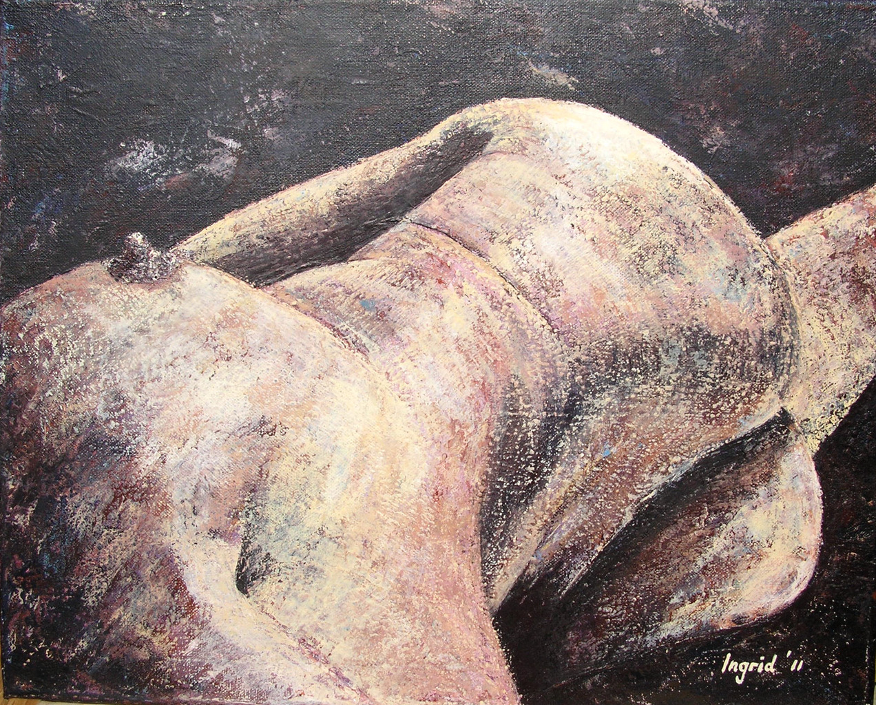 Ik ben Ingrid de Jong en leg mijn ziel en zaligheid in schilderen en tekenen. Een aantal jaren geleden ben ik schilderlessen gaan volgen. Ik kan me er totaal in verliezen en het stimuleert enorm om te groeien en geïnspireerd te worden door anderen. Het meest gelukkig ben ik in de natuur, met al zijn schoonheid en verwondering. Een onuitputtelijke bron van rust en energie. Het afgelopen jaar heb ik een andere bron ontdekt, die van het naakt. Eveneens onuitputtelijk en vol passie, erotiek en schoonheid. Ik vind het leuk om mijn schilderijen te voorzien van een kort verhaal of een gedicht, welke op www.ingriddejong.nl te lezen zijn.