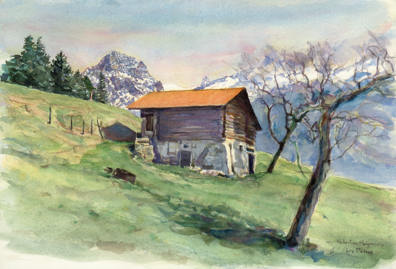 Koe Aquarel Bergen Koeien Cow Mountains 2003 Zwitserland Schuurtje Shed Swiss Meadow Bergwei Les-posses Poya