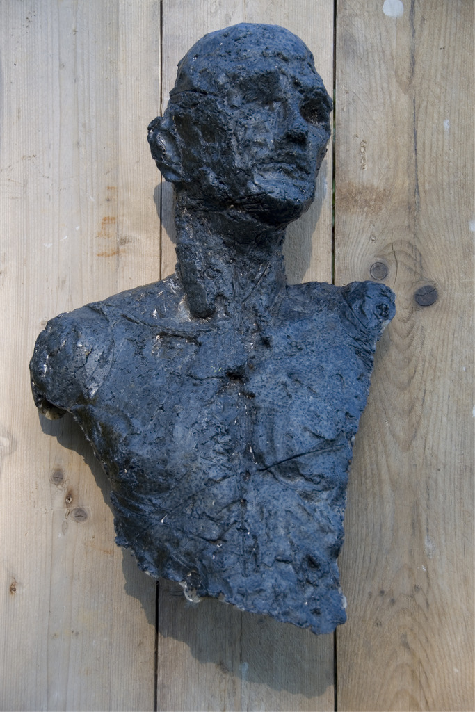 Portret naar model. De kop is geplaatst op een staande wand van steigerplanken.