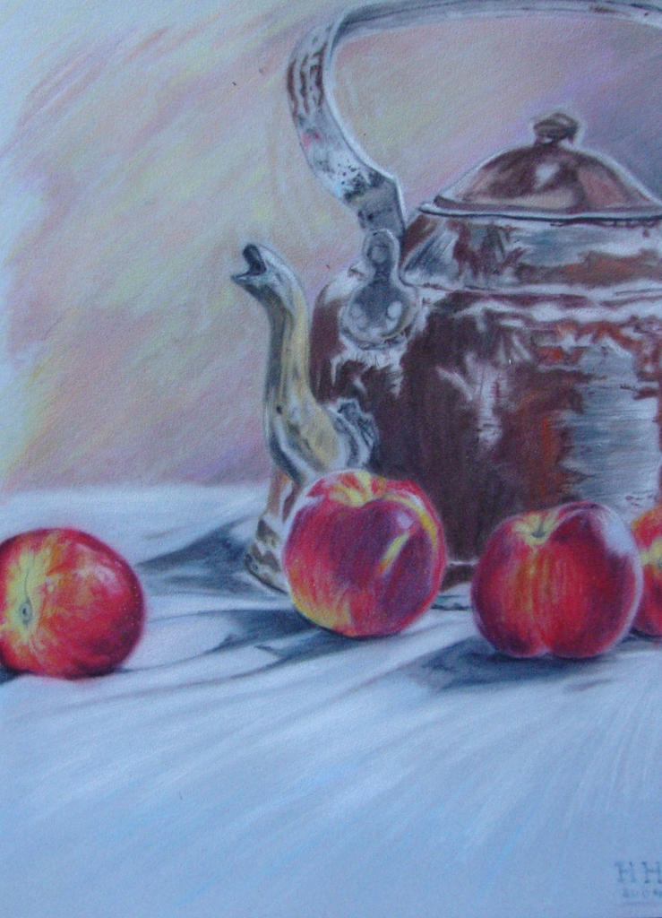 Een oude roestige waterketel met nectarines en expressieve achtergrond. Het is gemaakt met pastel op fluweelpapier,dat geeft een fluweelachtige effect.