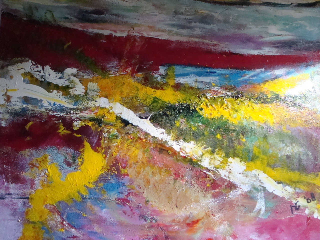 Veel kleuren gebruikt, (bijna) geheel met de vingers geschilderd. Er met heel veel plezier ('s nachts) aan gewerkt, de kleuren spatten haast van het doek. Zee, duinen??? Je zegt het maar.