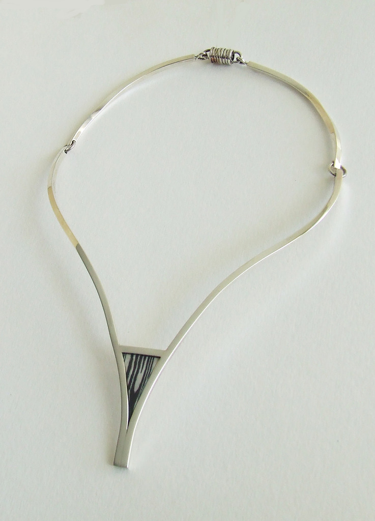 Zilveren halssieraad van vierkant materiaal. In de splitsing is zwart/wit porselein (Petrus Griepink) ingelegd. Met magnetische sluiting, hoogglans gepolijst. (ontwerpopdracht S1130)