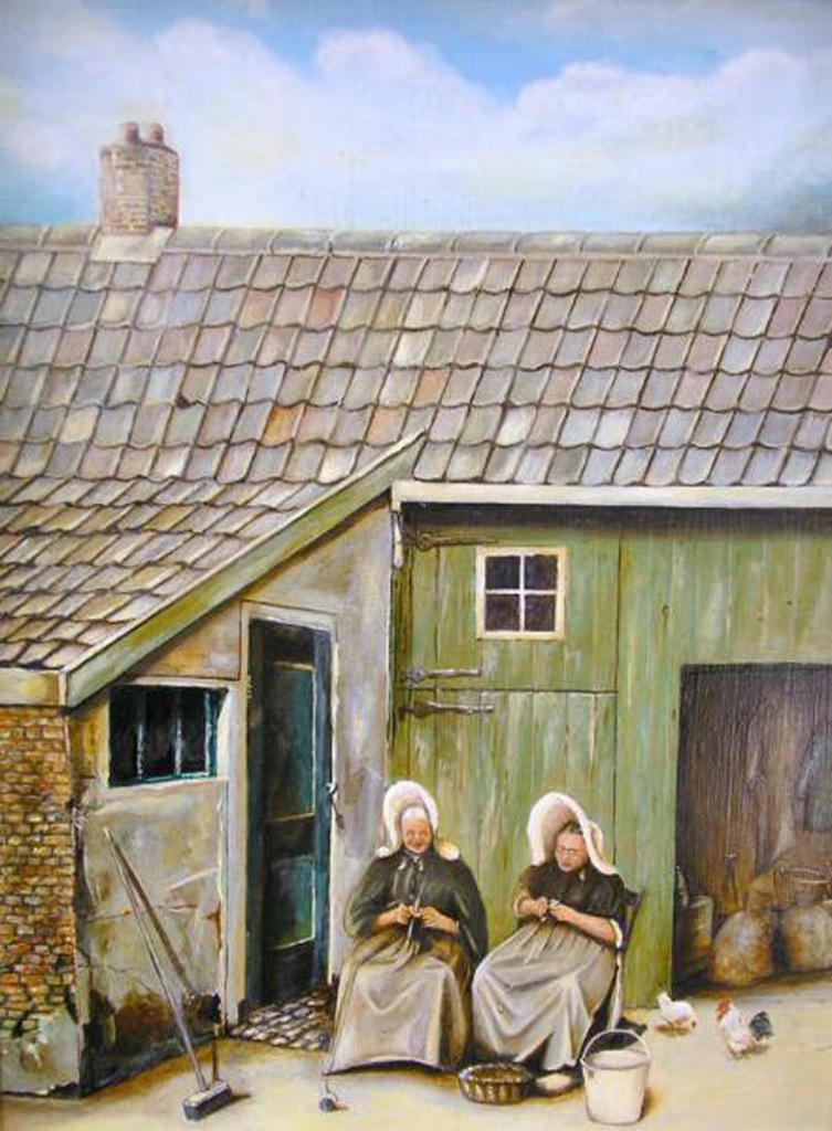 Twee Huizer boerinnetjes, voor een oude schuur.