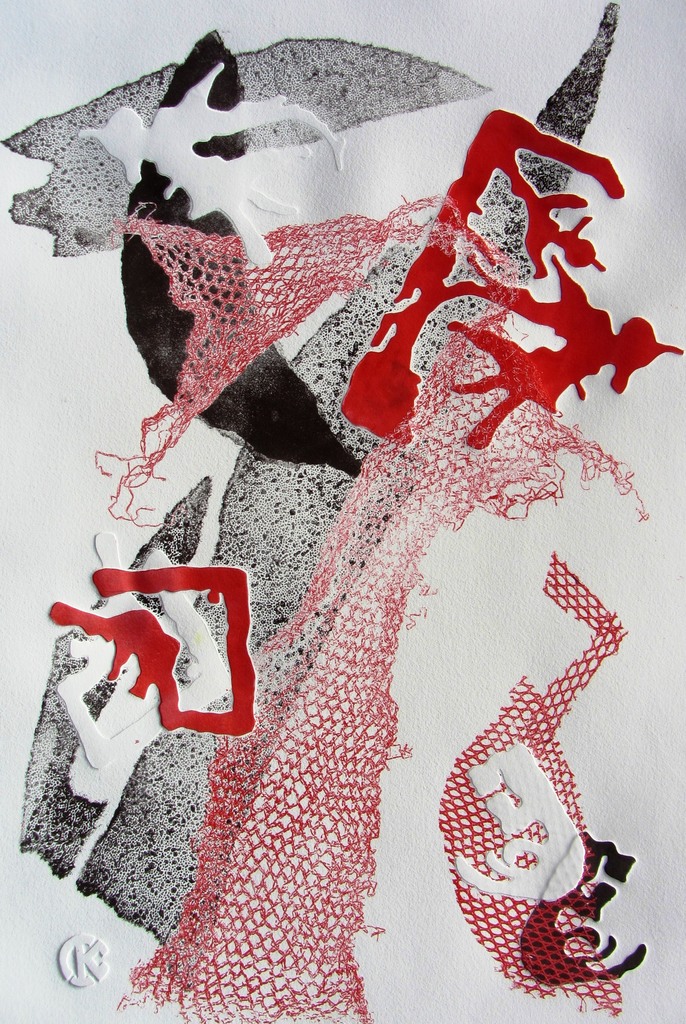 Een tweede composie met nagenoeg dezelfde elementen, met weer een in leegte en netwerk gevangen figuurtje. Prachtig lijnenspel en vormenspel. Geen oplage, maar slechts één afdruk.