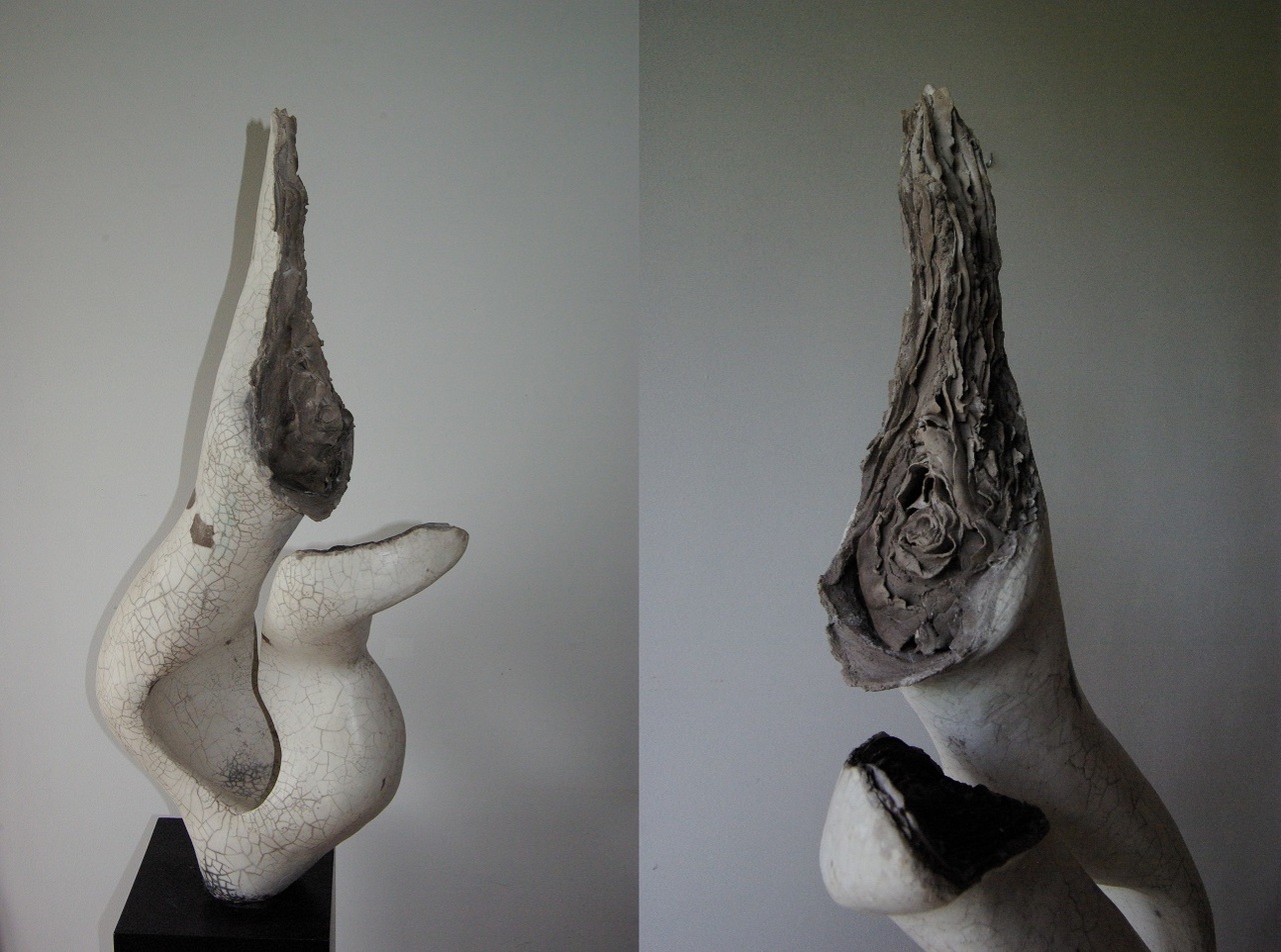 Mijn keramiek is rond, gebogen, zacht en geleidelijk verlopend met verrassende details van laagsgewijs opgebouwde onderdelen die juist speciale aandacht krijgen. Ik laat me uitdagen door het zogenaamde primitieve stoken; pitfire en naked raku.