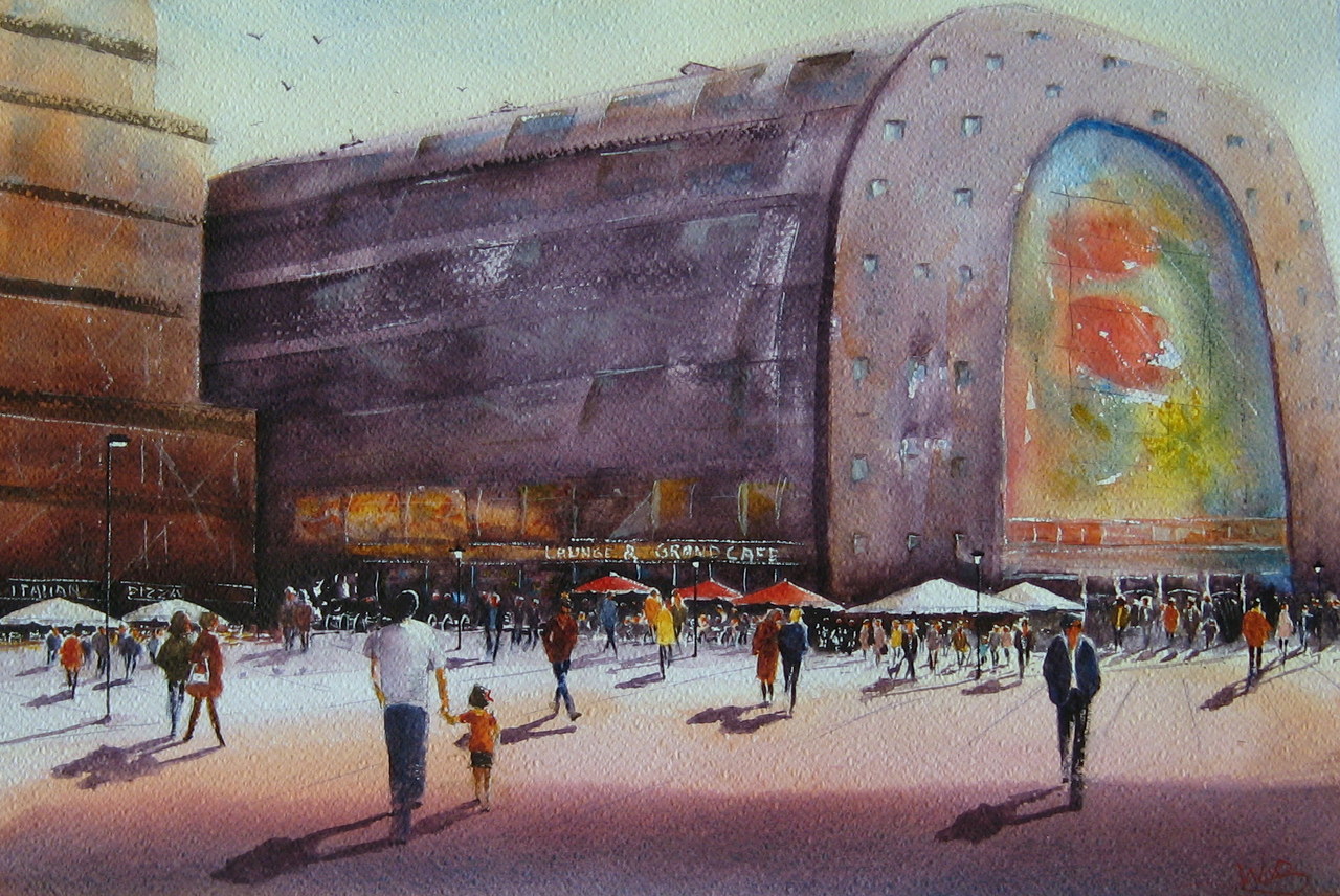 de nieuwe markthal in Rotteram , een uitdaging voor mij om zoveel mogelijk sfeer te creeren. Dit werk is tentoongesteld in Slovenië in 2015. Dit werk is verkocht.