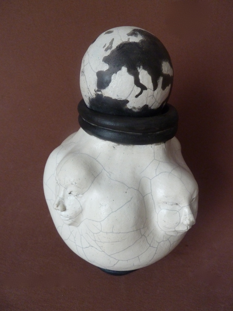 Zwart wit raku gestookt pot met 4 gezichten die verschillende rassen voorstellen met een wereldbol als deksel, geinspireerd door het liedje van de groep Blue Mink The melting pot uit 1988.