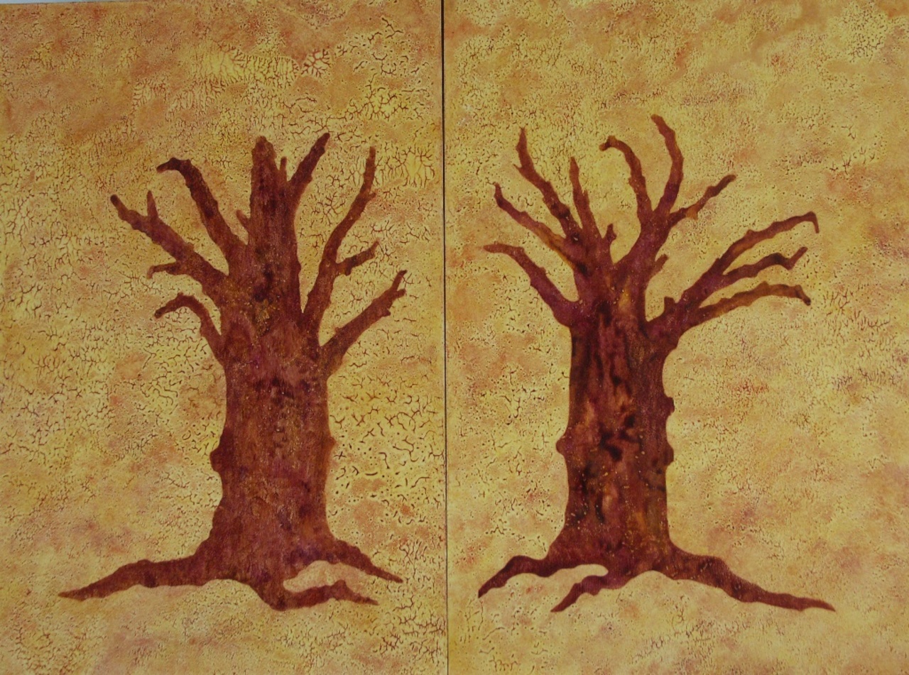 Lichte bijzondere structuur, zowel de bomen, als de achtergrond, die niet goed zichtbaar is op de foto. Worden samen verkocht. 2 x 40 x 60 cm.