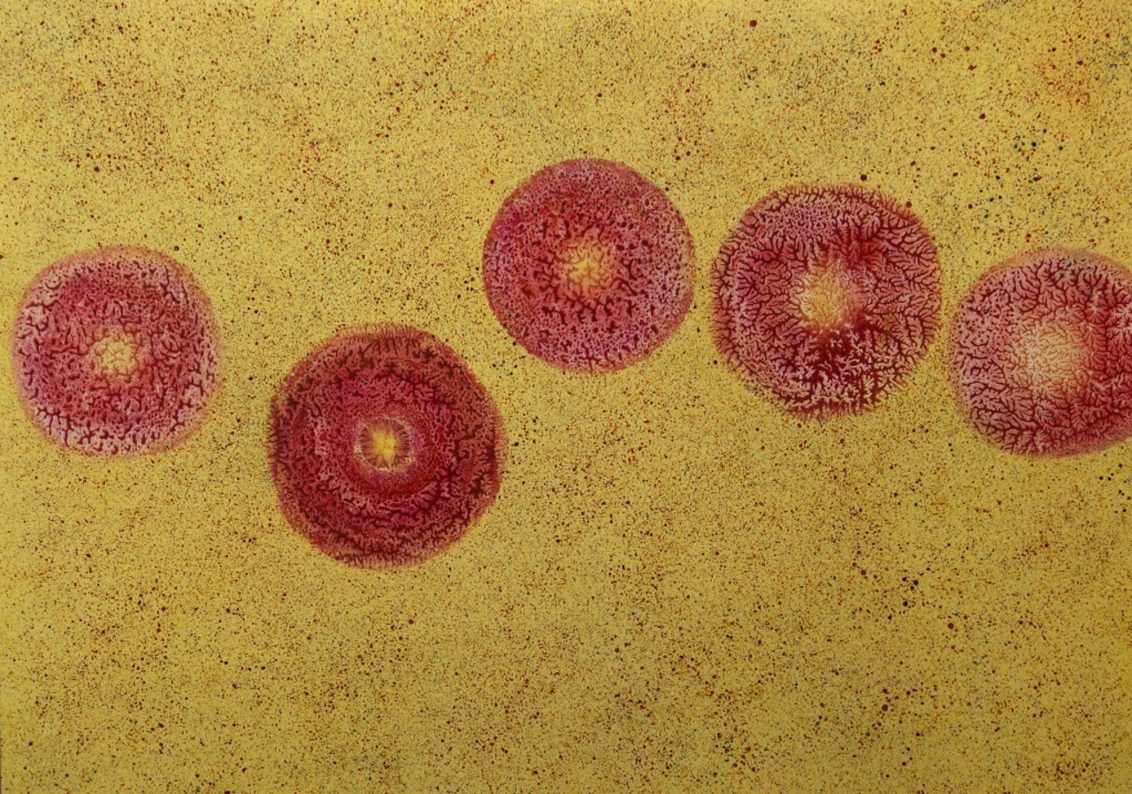 Dit schilderij hoort naast ritme 1. De cirkels hebben structuur. Het schilderij is 50 x 70 cm, samen 50 x 140 cm. Ze worden samen voor € 400 verkocht. De cirkels hebben structuur. De achtergrond van het schilderij is wat citroengeler van kleur. Er zitten blauwgroene spikkels in de achtergrond wat niet goed zichtbaar is.