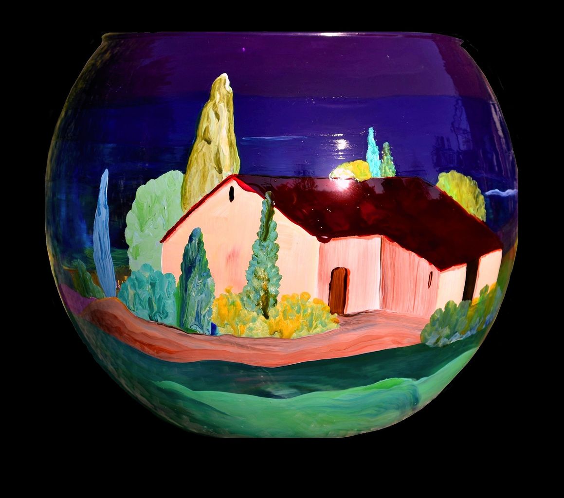 Ronde glazen bolvaas, beschilderd met een Frans landschap met boerderij. Ook te gebruiken als windlicht, dat geeft een prachtig kleurenspel op de muur. Hoogte 19 cm, doorsnede (rond) 24 cm. Inclusief certificaat van echtheid