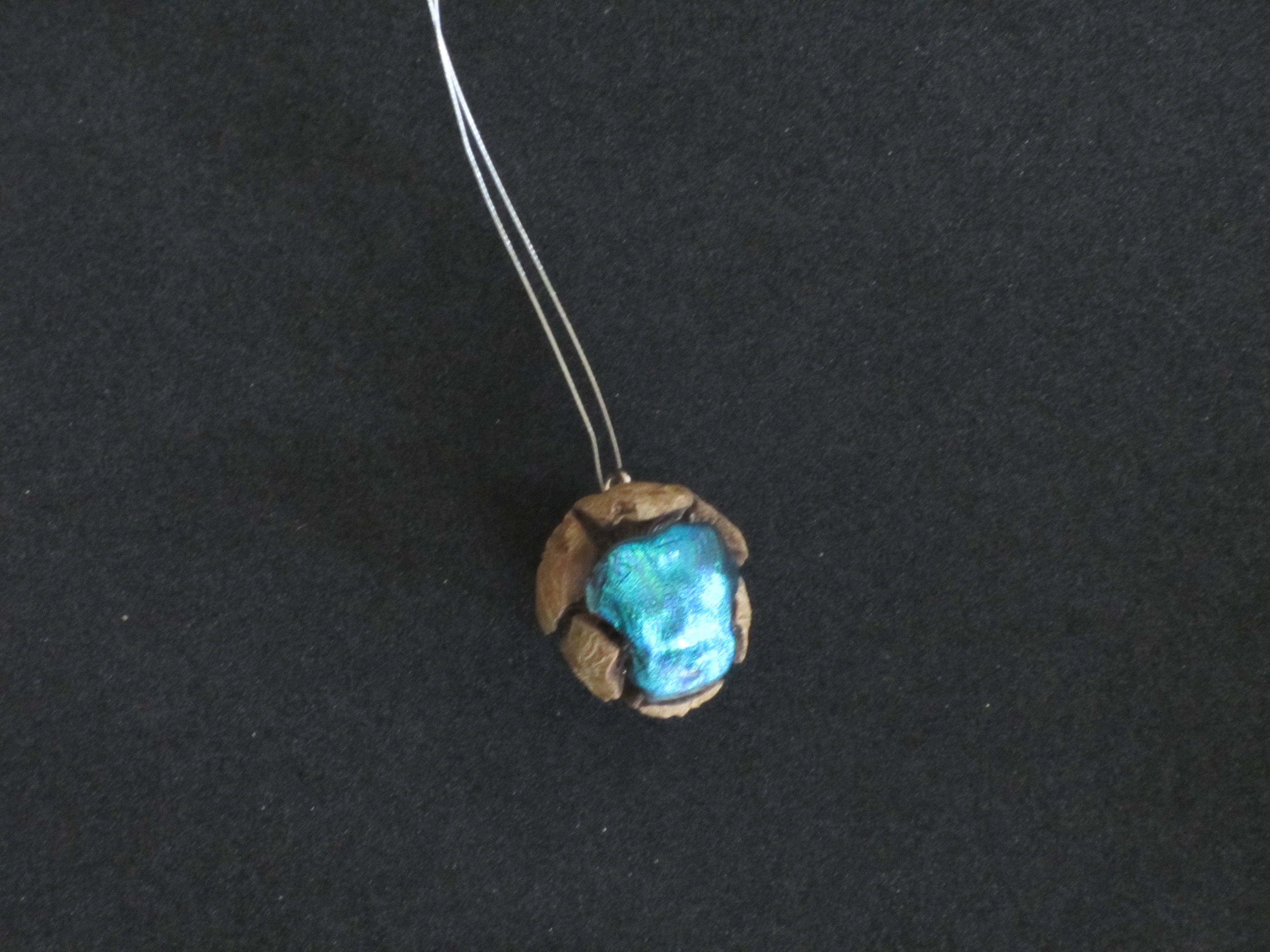 Sieraad van cipres zaadappeltje afgewerkt met blauwe en zilverkleurige Japanse lak. Een dergelijk sieraad kan op aanvraag gemaakt worden. Evt. ook in andere kleurstellingen.