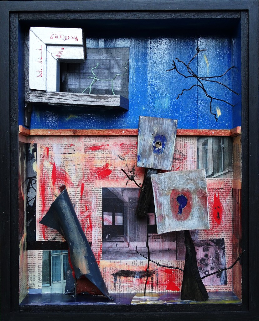 Theatre de Dirulice: In sommige theaters spreken de spelers / door het behang te lezen. // Hier is 't geval, dat de dame in het blauw / - alhoewel de kleur niet zeker is als we ons aan de waarheid houden - / wil ontsnappen aan de protestanten / die getooid zijn met vierkante hoofden. Assemblage, mixed media (wood, metal, paper, paint, glass)