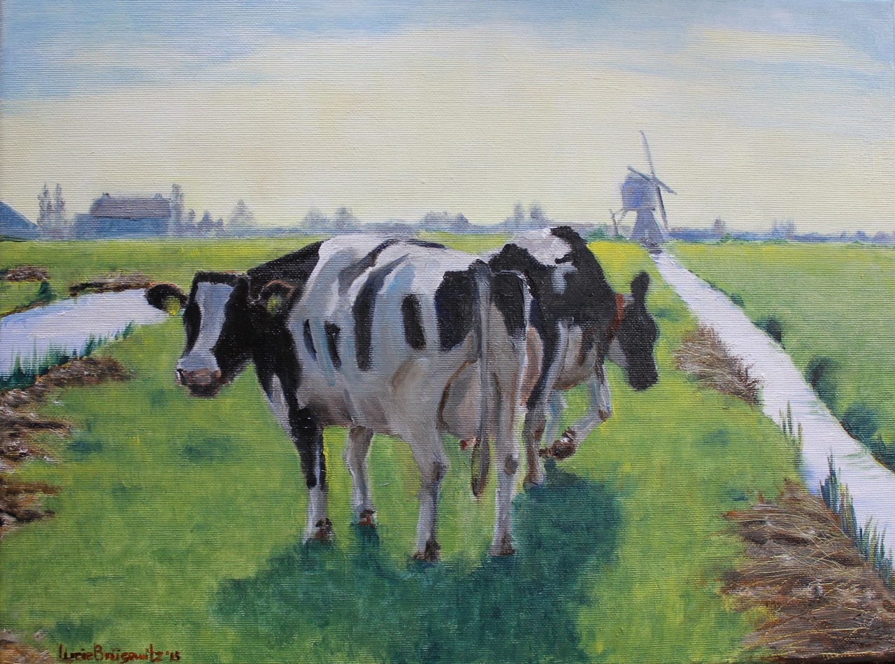 Warme voorjaarsdag met twee uitgelaten koeien. In de verte de molen van Langerak.