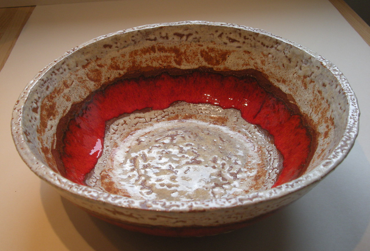 grote ronde schaal, rood steengoed met oranje en cremekleurig glazuur