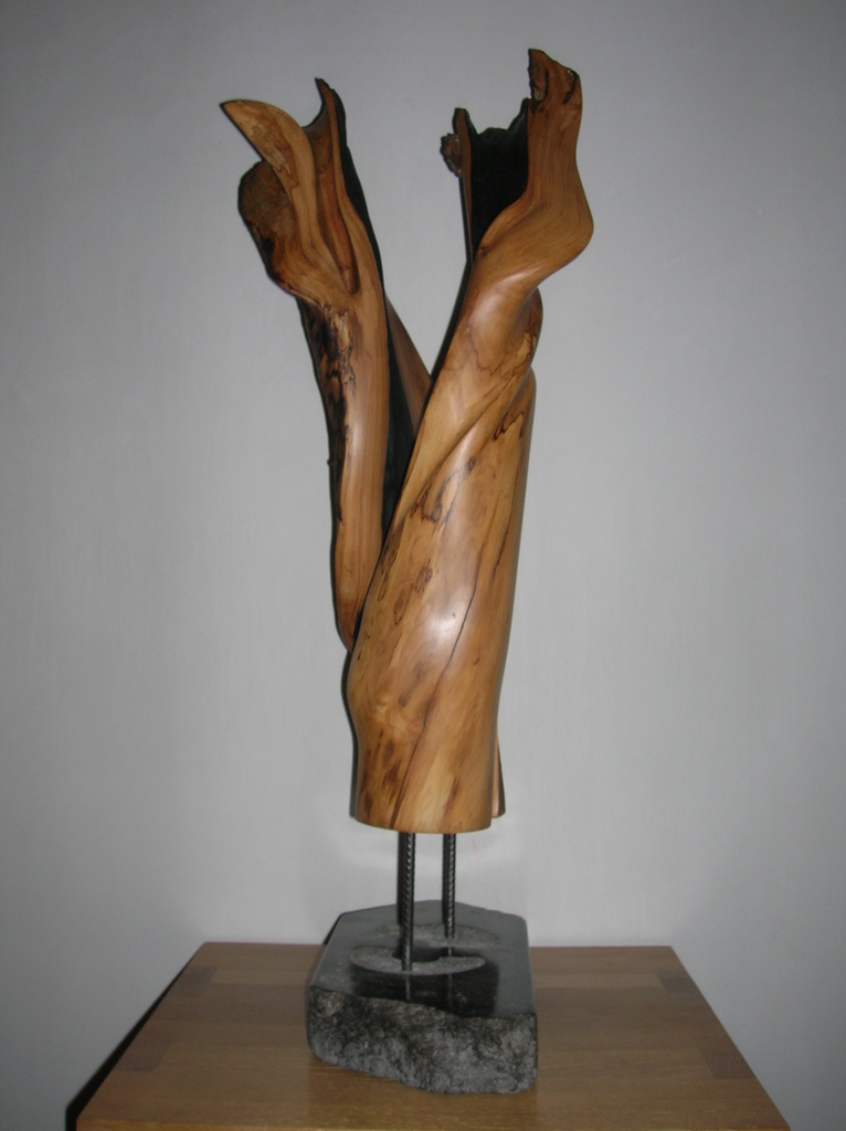 “Relatie” (82x30x35cm) - juni 2014. Ongekend getorst stammetje op sokkel van fijn geschuurde en bewerkte blauwe steen. Als koppel ooit samen, nu los van elkaar. Vurige kern of opgebrand? IN PRIVEBEZIT- kan bezichtigd worden