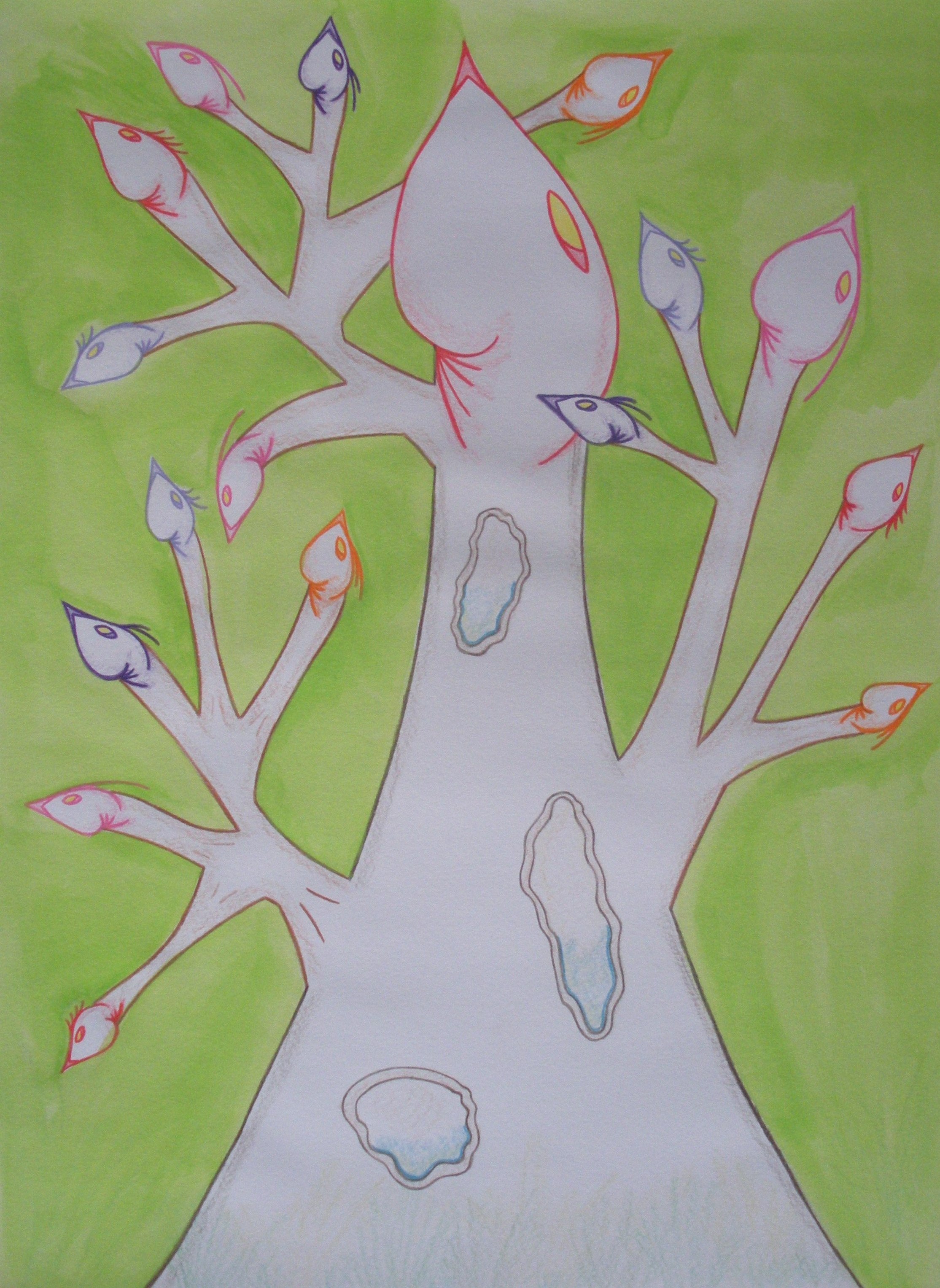 Ik werk intuïtief en maak wat mijn handen en gevoel me ingeven. Dat varieert van tekeningen, schilderijen, leemwerken, textielart, papiermache of gecombineerde technieken. Bij mijn werken zet ik veelal de materiaalkosten en laat het aan de koper over wat hij of zij hiervoor over heeft.