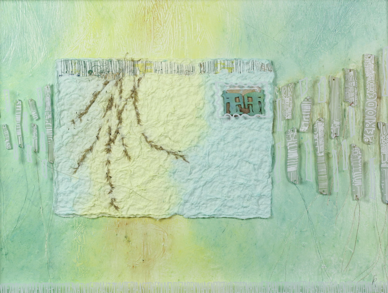 handgeschept papier, tekst, acryl