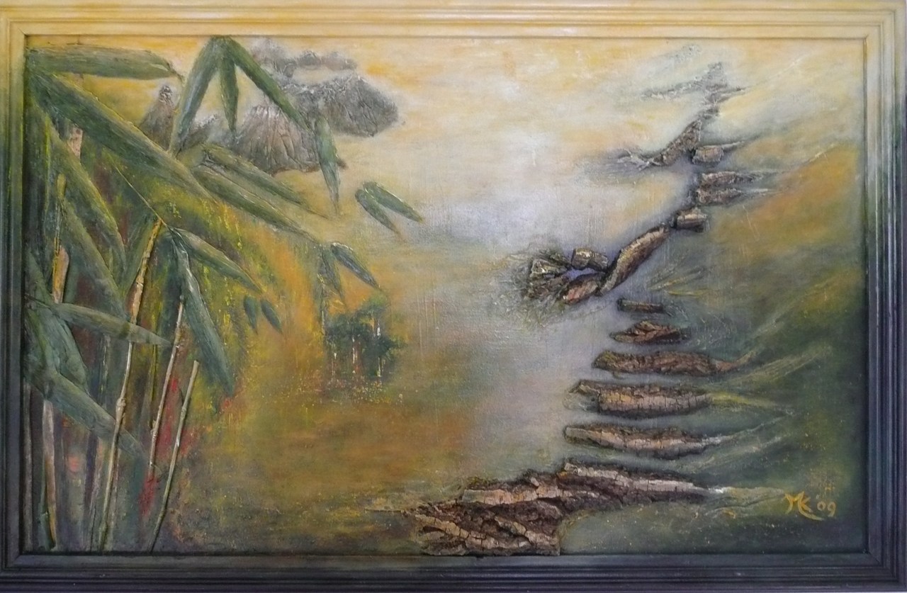 De Weg, collage boomschors op houten paneel (incl. lijst), acryl.