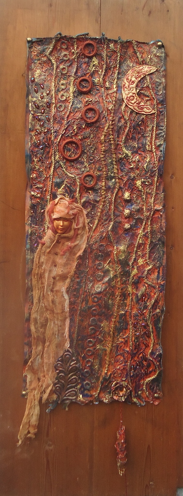Schilderij Bruin Maan Papier Herfst Textiel Collage Godin Crone Muurkunst Wandhanger
