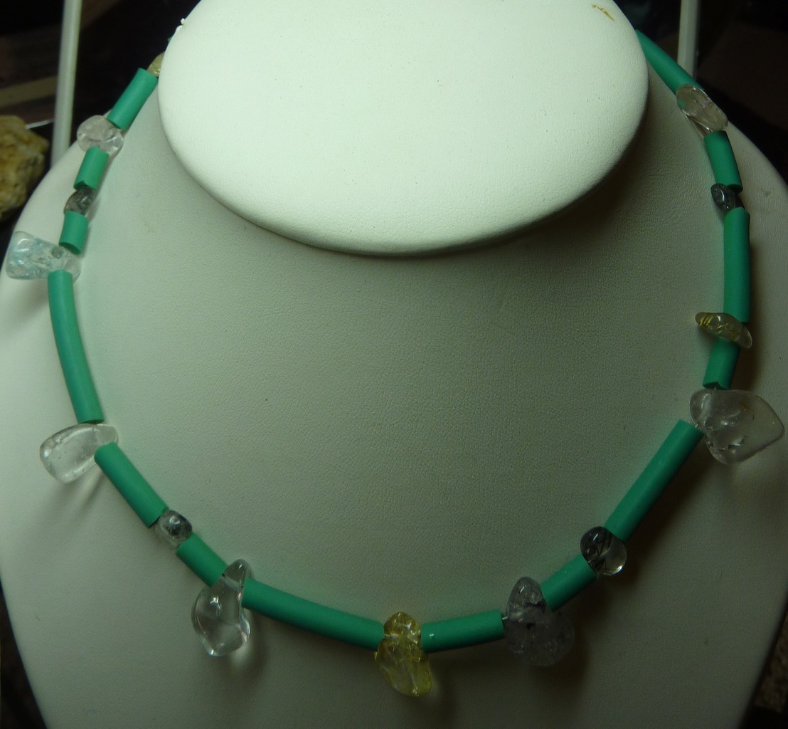 Onverwachte combinatie van verschillende soorten kristal met groen rubber op gecoat staaldraad